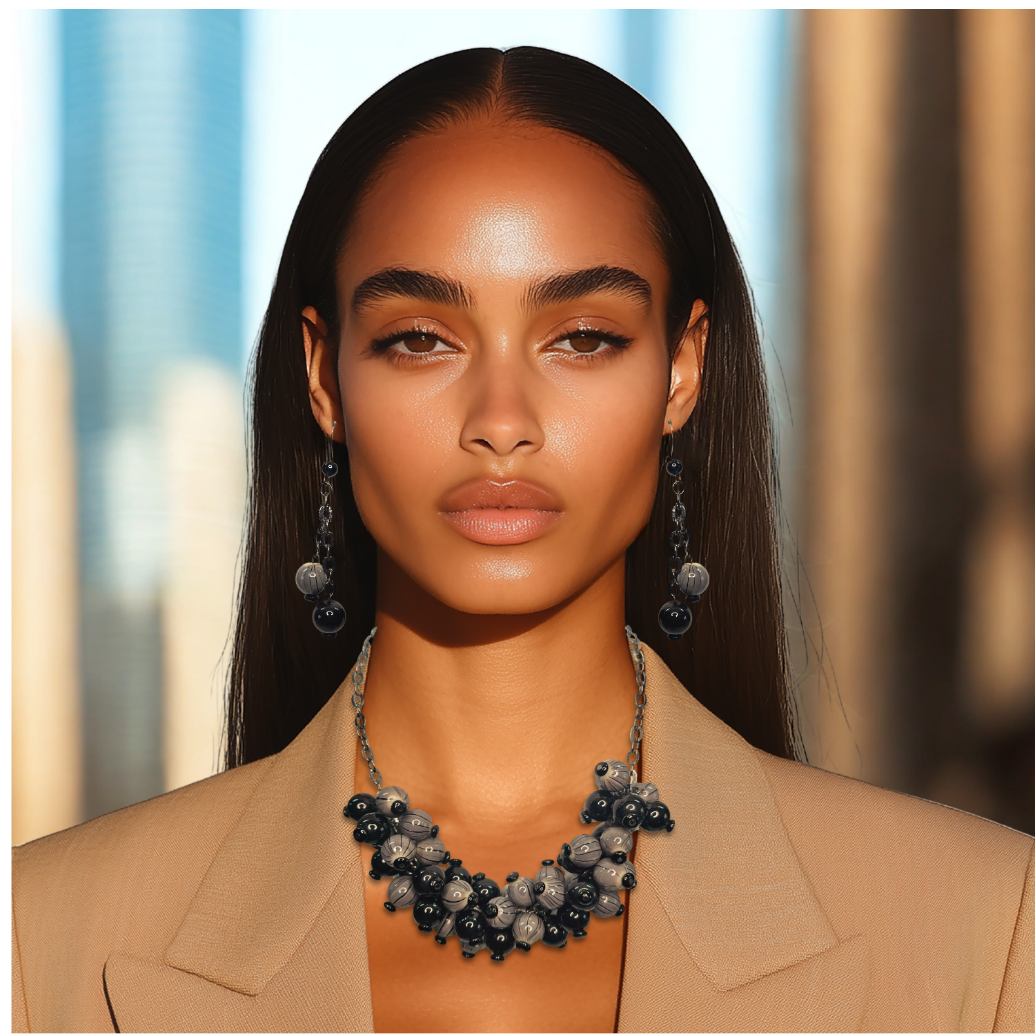 Chunky Black and Grey Beaded Necklace and Matching Dangle Earings