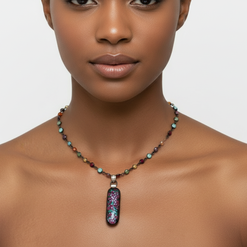 This 2.5-inch Oval Dichroic Fused Glass Pendant showcases vibrant, shifting colors created through expert layering of dichroic glass. Suspended on an 18-inch multi-color glass beaded chain, it combines artistry with wearable elegance. The pendant reflects light uniquely, offering a dynamic accessory that complements sophisticated style with durable craftsmanship. Ideal for those who appreciate finely crafted glass jewelry with a distinct, contemporary edge.